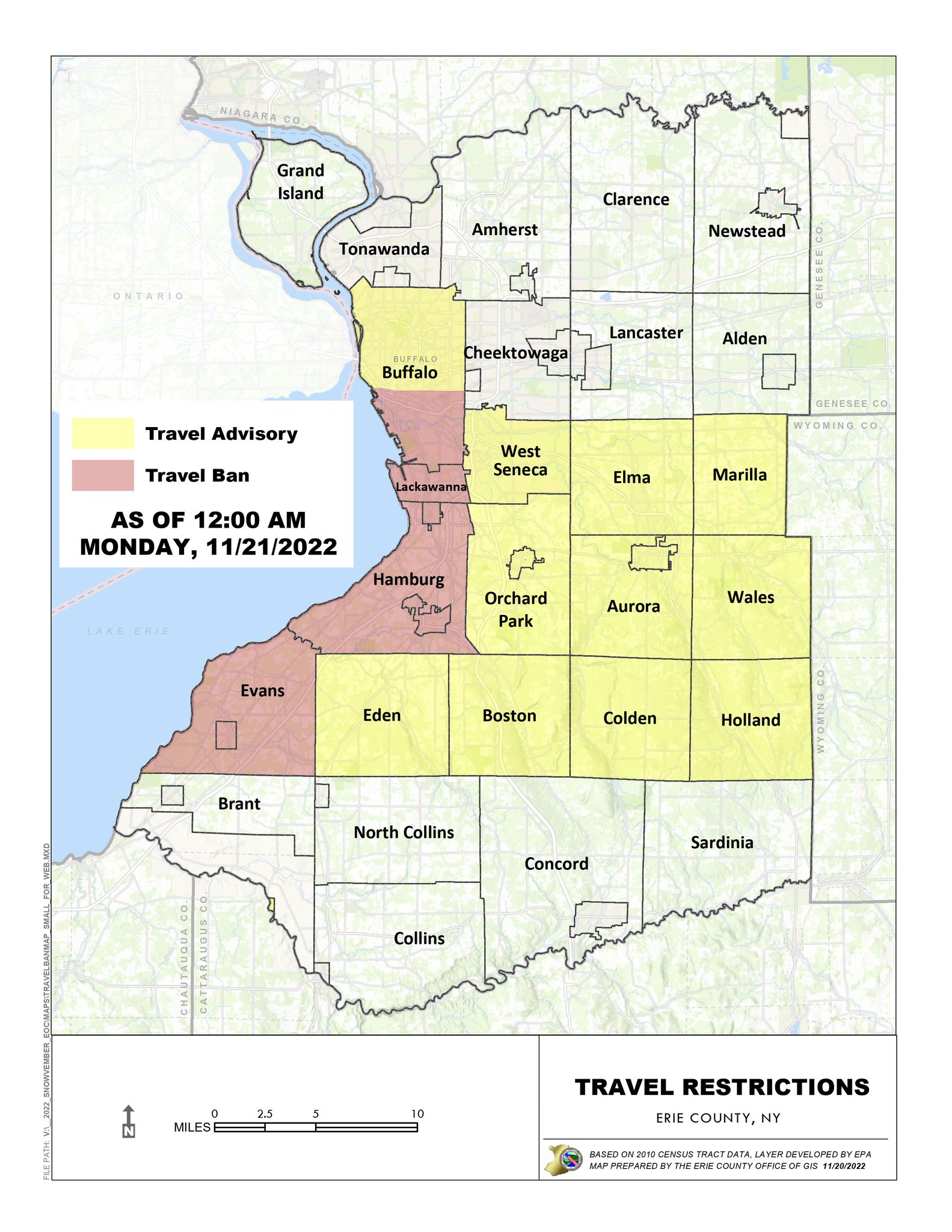 Webjan 18, 2024 · all travel bans will be lifted in erie county as of 8 a. m. A travel advisory remains in place until 7 p. m. Webnov 18, 2022 · as of 5 pm, the buffalo has lifted the final travel ban in erie county. About half the county remains in a travel advisory, yellow on the attached map: Webjan 14, 2024 · update, 10:30 p. m: The travel ban in erie county will be lifted in most areas at 6 a. m. Monday, including the thruway, according to a joint statement from gov. Webjan 17, 2024 · the travel ban issued for hamburg was lifted at 5:30 a. m. And the ban for lackawanna was lifted as of 7 a. m. The travel bans for the city of buffalo.